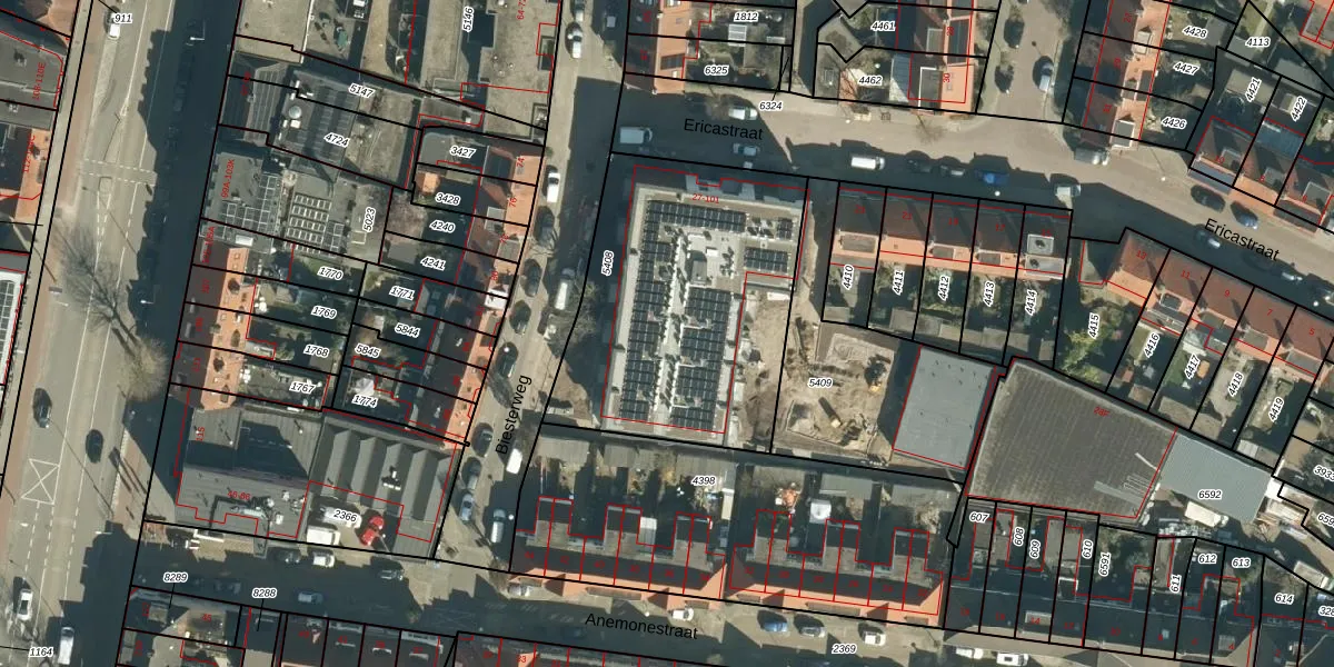 Ericastraat 55 is gelegen op kadastraal perceel STM00D5408. Deze kadastrale aanduiding is uniek en wordt gebruikt door het Kadaster om eigendomsrechten en andere zakelijke rechten vast te leggen. Het perceel maakt onderdeel uit van de kadastrale gemeente Stratum.