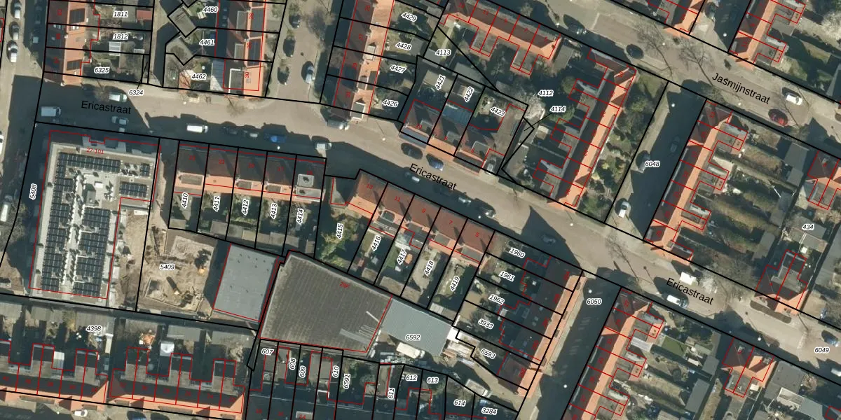 Ericastraat 9 is gelegen op kadastraal perceel STM00D4417. Deze kadastrale aanduiding is uniek en wordt gebruikt door het Kadaster om eigendomsrechten en andere zakelijke rechten vast te leggen. Het perceel maakt onderdeel uit van de kadastrale gemeente Stratum.