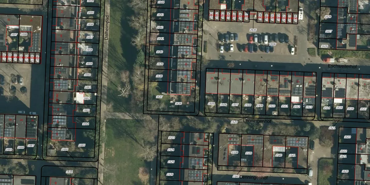 Het perceel waarop Eschweilerhof 31 staat heeft een oppervlakte van 401 m². Dit is een groot perceel. De perceeloppervlakte wordt geregistreerd door het Kadaster. Gedetailleerde informatie over de maten van dit perceel kunt u vinden in het rapport Kadastrale kaart met maatvoering van Eschweilerhof 31.