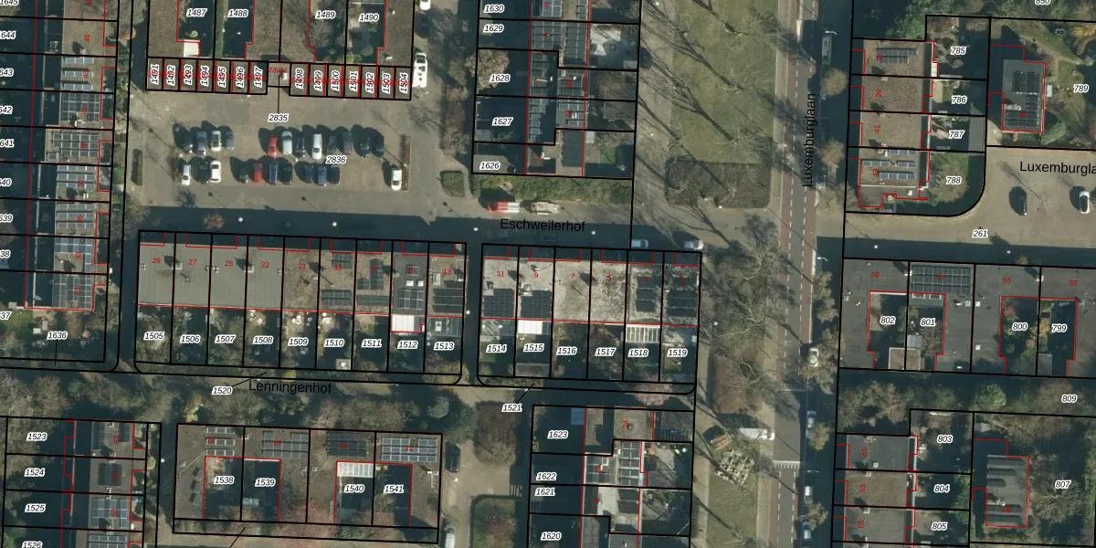 Het perceel waarop Eschweilerhof 9 staat heeft een oppervlakte van 159 m². Dit is een middelgroot perceel. De perceeloppervlakte wordt geregistreerd door het Kadaster. Gedetailleerde informatie over de maten van dit perceel kunt u vinden in het rapport Kadastrale kaart met maatvoering van Eschweilerhof 9.