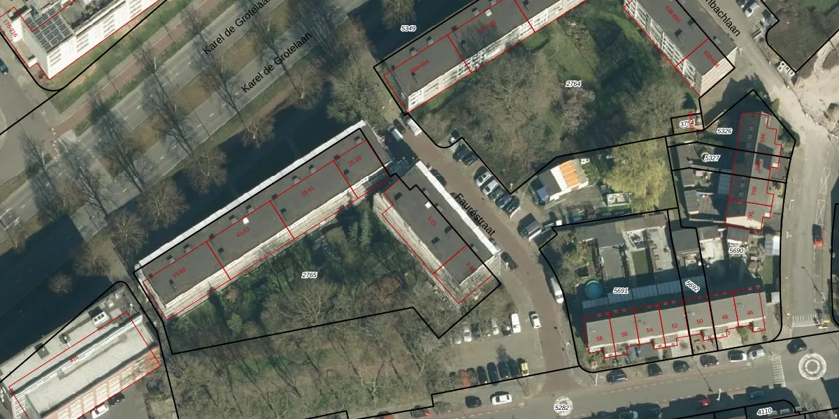 Het perceel waarop Fauréstraat 11 staat heeft een oppervlakte van 2546 m². Dit is een zeer groot perceel. De perceeloppervlakte wordt geregistreerd door het Kadaster. Gedetailleerde informatie over de maten van dit perceel kunt u vinden in het rapport Kadastrale kaart met maatvoering van Fauréstraat 11.
