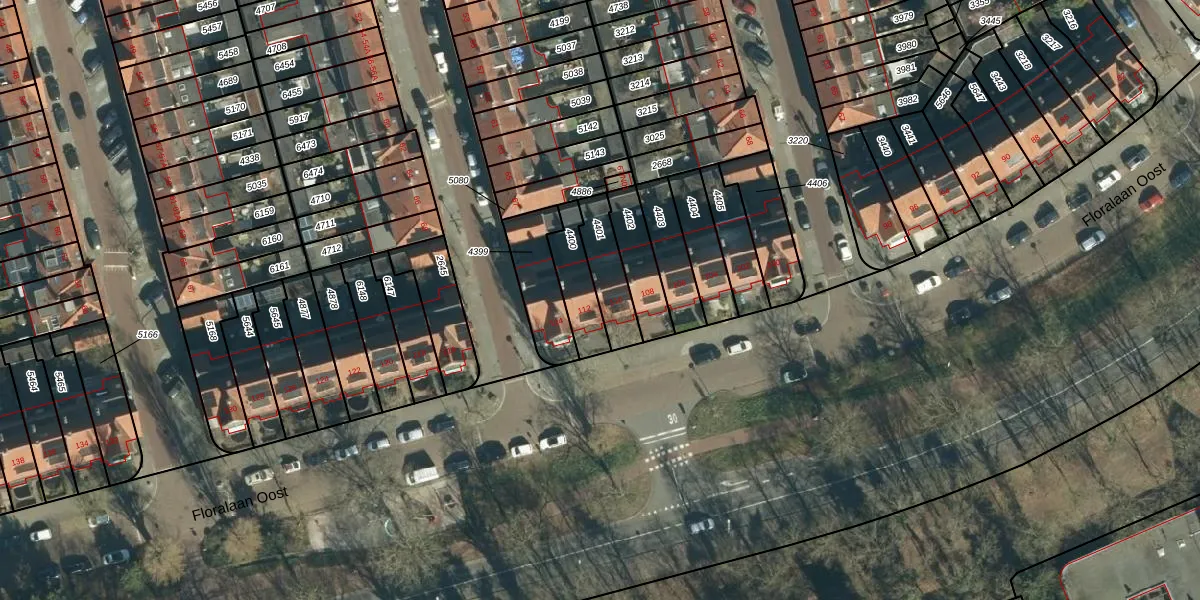 Floralaan Oost 110 is gelegen op kadastraal perceel STM00D4401. Deze kadastrale aanduiding is uniek en wordt gebruikt door het Kadaster om eigendomsrechten en andere zakelijke rechten vast te leggen. Het perceel maakt onderdeel uit van de kadastrale gemeente Stratum.
