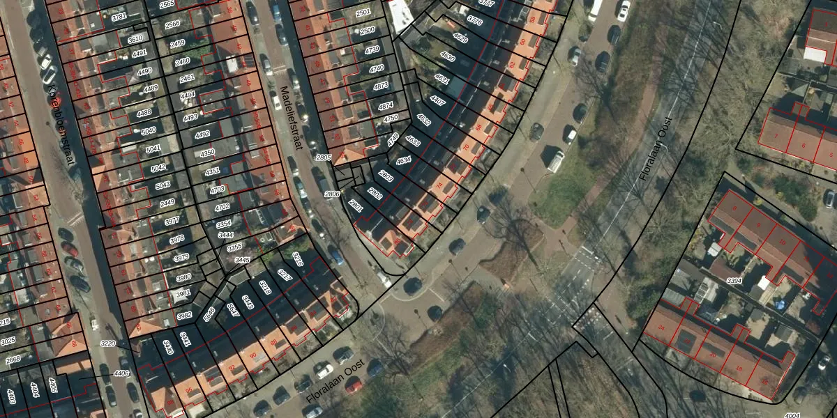 Floralaan Oost 76 is gelegen op kadastraal perceel STM00D2803. Deze kadastrale aanduiding is uniek en wordt gebruikt door het Kadaster om eigendomsrechten en andere zakelijke rechten vast te leggen. Het perceel maakt onderdeel uit van de kadastrale gemeente Stratum.
