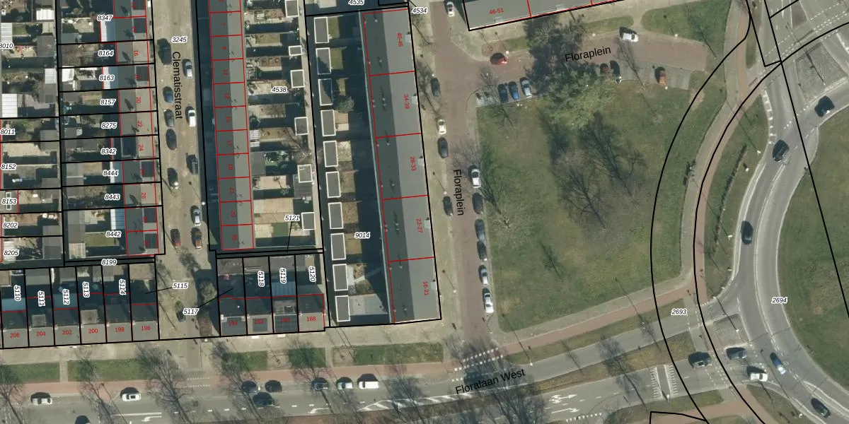 Het perceel waarop Floraplein 23 staat heeft een oppervlakte van 1872 m². Dit is een zeer groot perceel. De perceeloppervlakte wordt geregistreerd door het Kadaster. Gedetailleerde informatie over de maten van dit perceel kunt u vinden in het rapport Kadastrale kaart met maatvoering van Floraplein 23.
