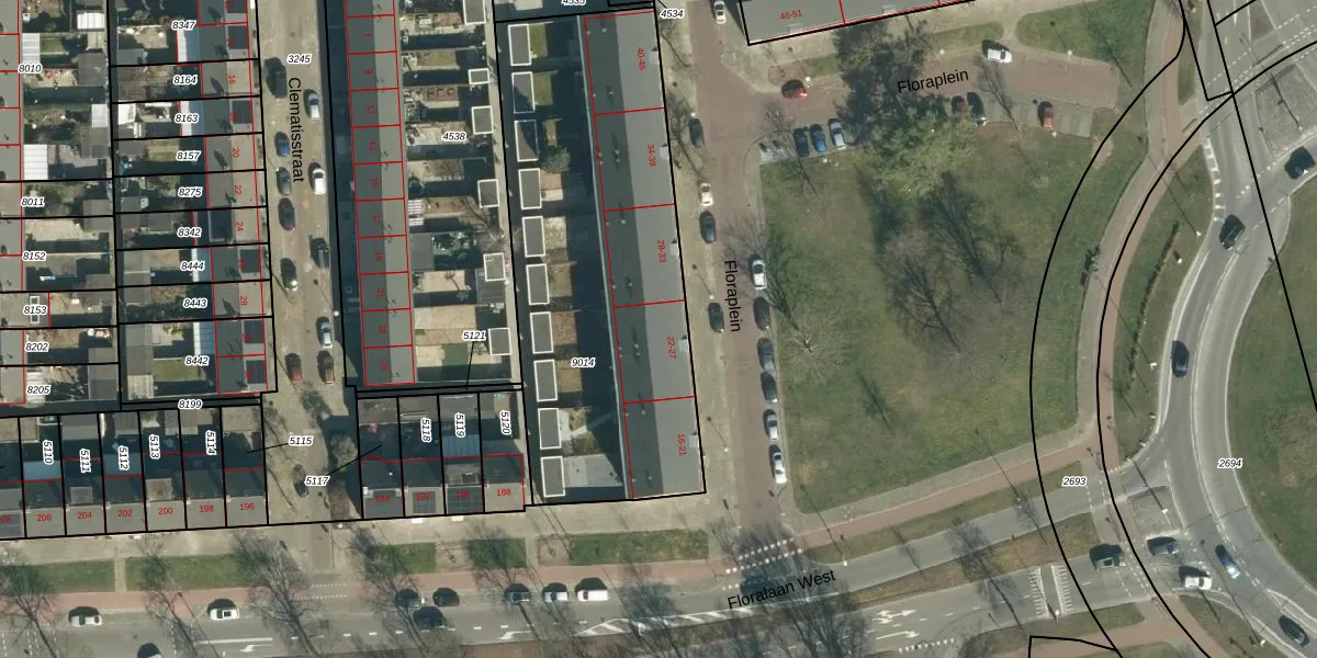 Het perceel waarop Floraplein 25 staat heeft een oppervlakte van 1872 m². Dit is een zeer groot perceel. De perceeloppervlakte wordt geregistreerd door het Kadaster. Gedetailleerde informatie over de maten van dit perceel kunt u vinden in het rapport Kadastrale kaart met maatvoering van Floraplein 25.