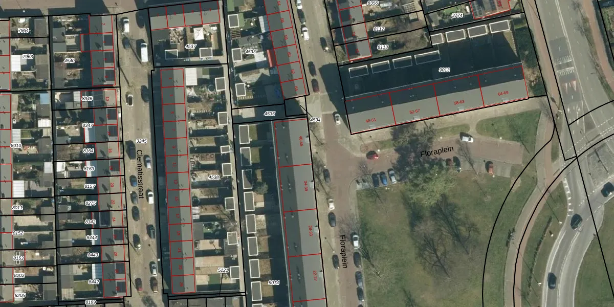 Het perceel waarop Floraplein 40 staat heeft een oppervlakte van 1872 m². Dit is een zeer groot perceel. De perceeloppervlakte wordt geregistreerd door het Kadaster. Gedetailleerde informatie over de maten van dit perceel kunt u vinden in het rapport Kadastrale kaart met maatvoering van Floraplein 40.