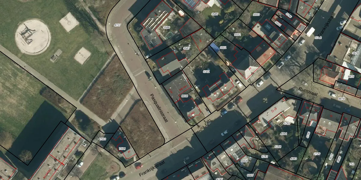 Het perceel waarop Frankrijkstraat 34-E staat heeft een oppervlakte van 405 m². Dit is een groot perceel. De perceeloppervlakte wordt geregistreerd door het Kadaster. Gedetailleerde informatie over de maten van dit perceel kunt u vinden in het rapport Kadastrale kaart met maatvoering van Frankrijkstraat 34-E.
