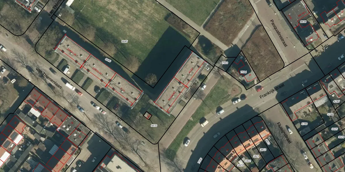 Het perceel waarop Frankrijkstraat 56 staat heeft een oppervlakte van 2905 m². Dit is een zeer groot perceel. De perceeloppervlakte wordt geregistreerd door het Kadaster. Gedetailleerde informatie over de maten van dit perceel kunt u vinden in het rapport Kadastrale kaart met maatvoering van Frankrijkstraat 56.