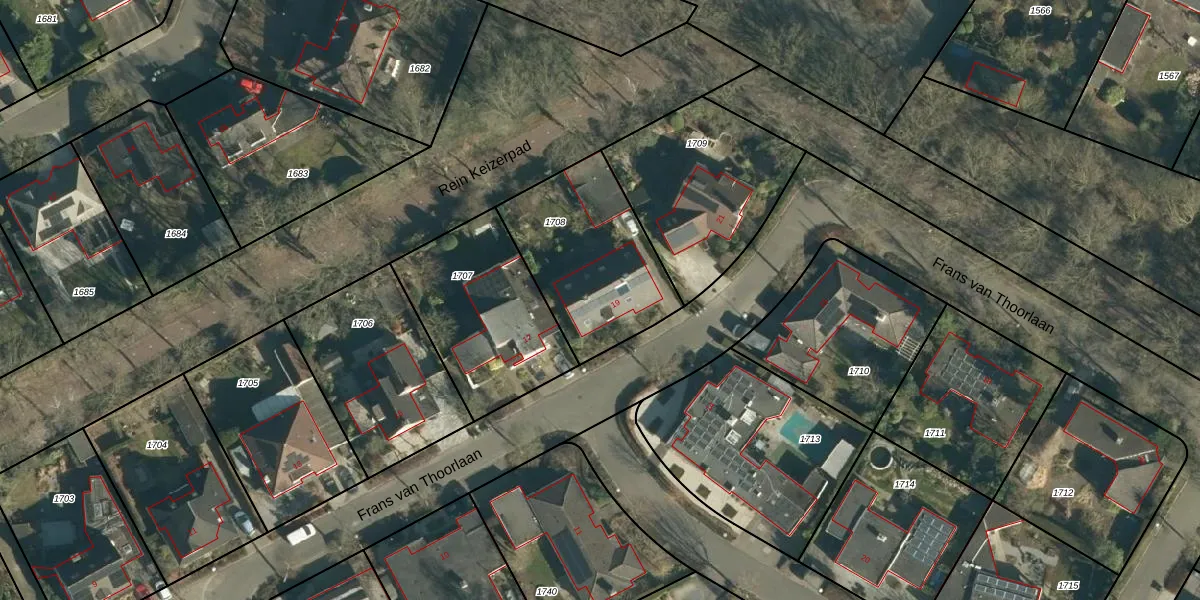 Het perceel waarop Frans van Thoorlaan 19 staat heeft een oppervlakte van 596 m². Dit is een groot perceel. De perceeloppervlakte wordt geregistreerd door het Kadaster. Gedetailleerde informatie over de maten van dit perceel kunt u vinden in het rapport Kadastrale kaart met maatvoering van Frans van Thoorlaan 19.