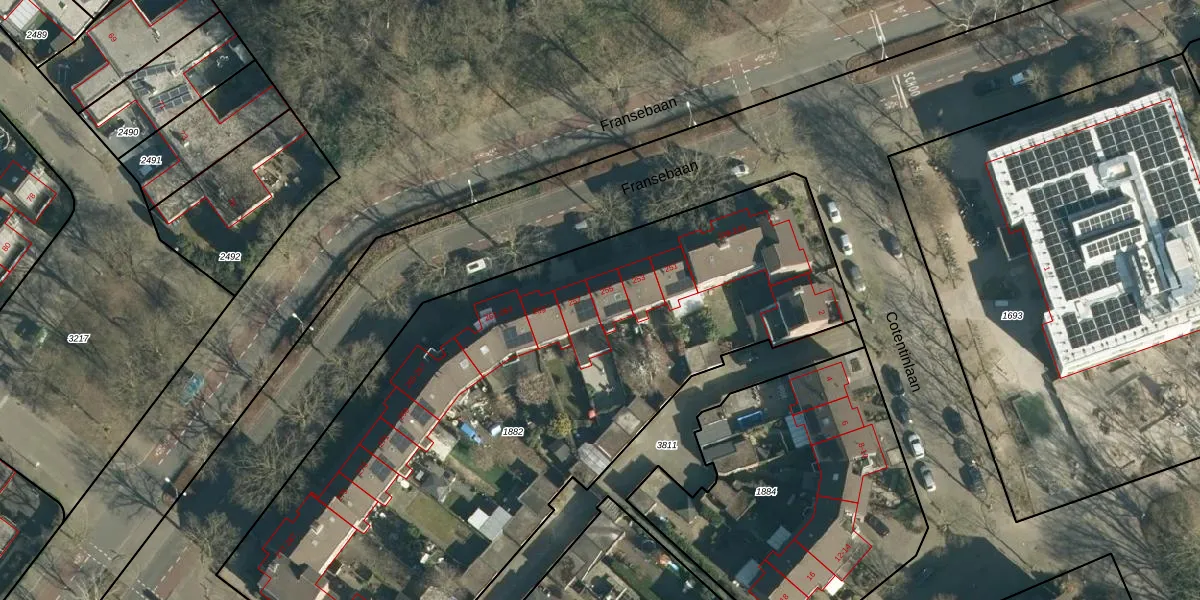 Fransebaan 255 is gelegen op kadastraal perceel WSL01S1882. Deze kadastrale aanduiding is uniek en wordt gebruikt door het Kadaster om eigendomsrechten en andere zakelijke rechten vast te leggen. Het perceel maakt onderdeel uit van de kadastrale gemeente Woensel.