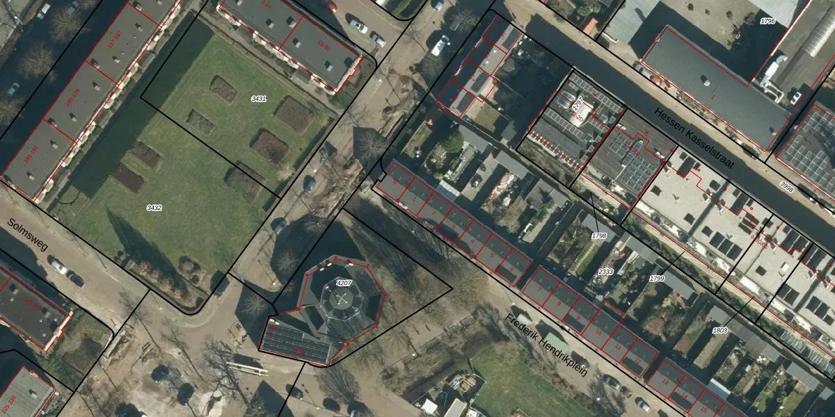 Het perceel waarop Frederik Hendrikplein 1 staat heeft een oppervlakte van 4046 m². Dit is een zeer groot perceel. De perceeloppervlakte wordt geregistreerd door het Kadaster. Gedetailleerde informatie over de maten van dit perceel kunt u vinden in het rapport Kadastrale kaart met maatvoering van Frederik Hendrikplein 1.