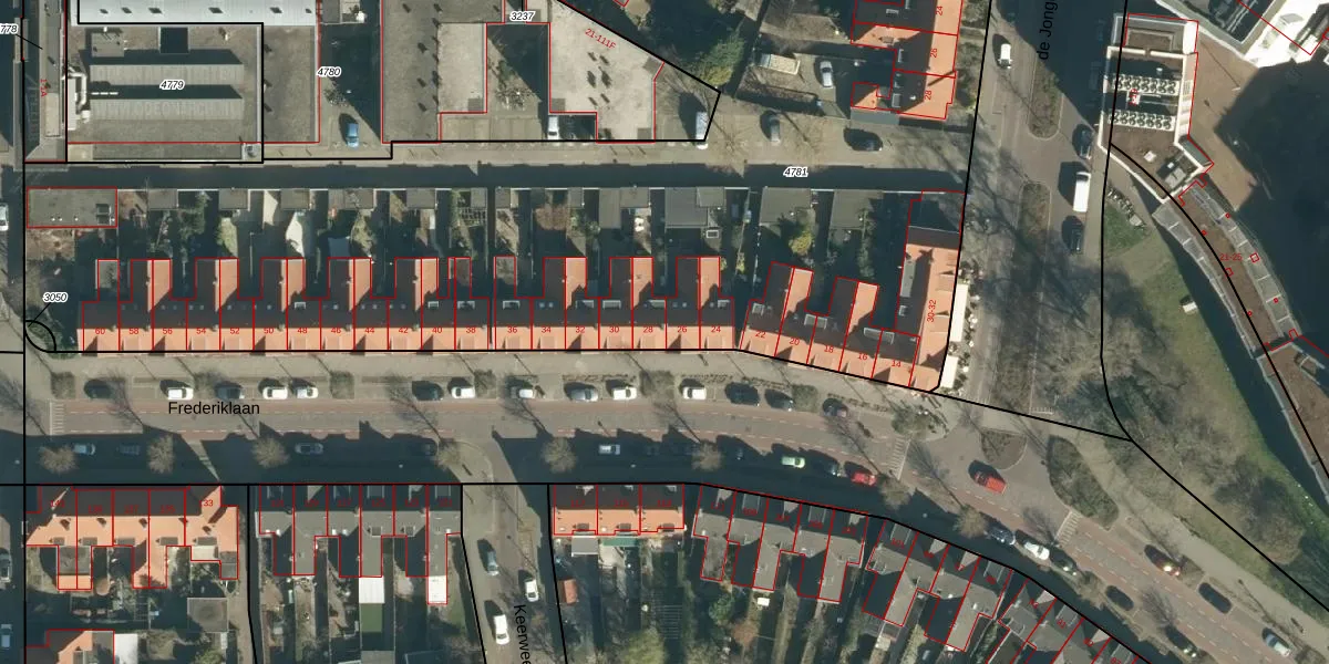 Frederiklaan 28 is gelegen op kadastraal perceel STR03C4781. Deze kadastrale aanduiding is uniek en wordt gebruikt door het Kadaster om eigendomsrechten en andere zakelijke rechten vast te leggen. Het perceel maakt onderdeel uit van de kadastrale gemeente Strijp.