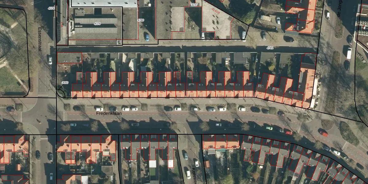 Frederiklaan 38 is gelegen op kadastraal perceel STR03C4781. Deze kadastrale aanduiding is uniek en wordt gebruikt door het Kadaster om eigendomsrechten en andere zakelijke rechten vast te leggen. Het perceel maakt onderdeel uit van de kadastrale gemeente Strijp.