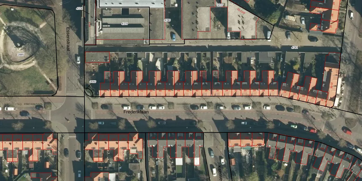 Frederiklaan 44 is gelegen op kadastraal perceel STR03C4781. Deze kadastrale aanduiding is uniek en wordt gebruikt door het Kadaster om eigendomsrechten en andere zakelijke rechten vast te leggen. Het perceel maakt onderdeel uit van de kadastrale gemeente Strijp.