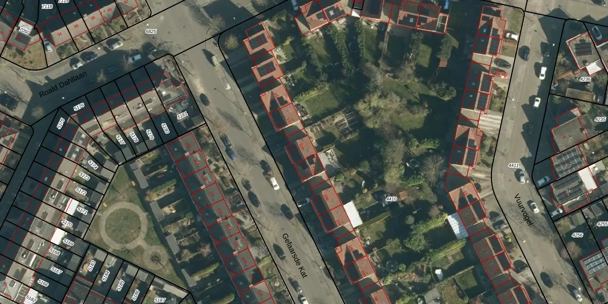 Gelaarsde Kat 110 is gelegen op kadastraal perceel WSL01W4410. Deze kadastrale aanduiding is uniek en wordt gebruikt door het Kadaster om eigendomsrechten en andere zakelijke rechten vast te leggen. Het perceel maakt onderdeel uit van de kadastrale gemeente Woensel.