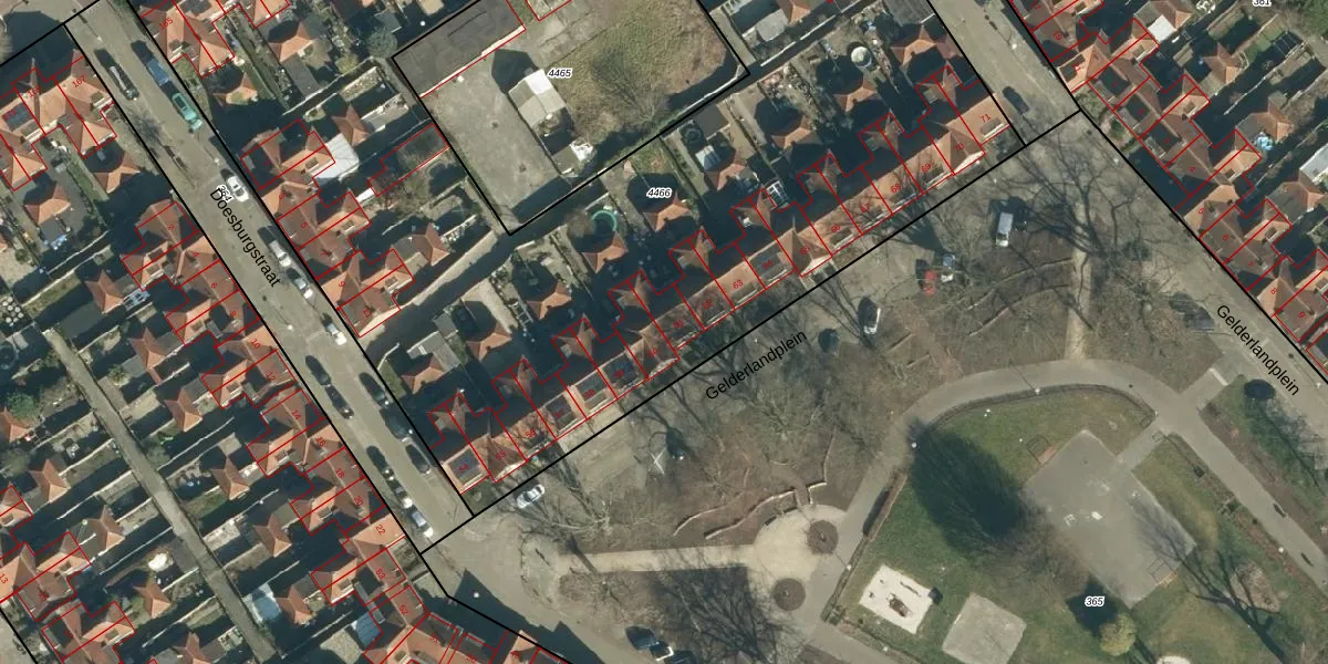 Het perceel waarop Gelderlandplein 61 staat heeft een oppervlakte van 8221 m². Dit is een zeer groot perceel. De perceeloppervlakte wordt geregistreerd door het Kadaster. Gedetailleerde informatie over de maten van dit perceel kunt u vinden in het rapport Kadastrale kaart met maatvoering van Gelderlandplein 61.
