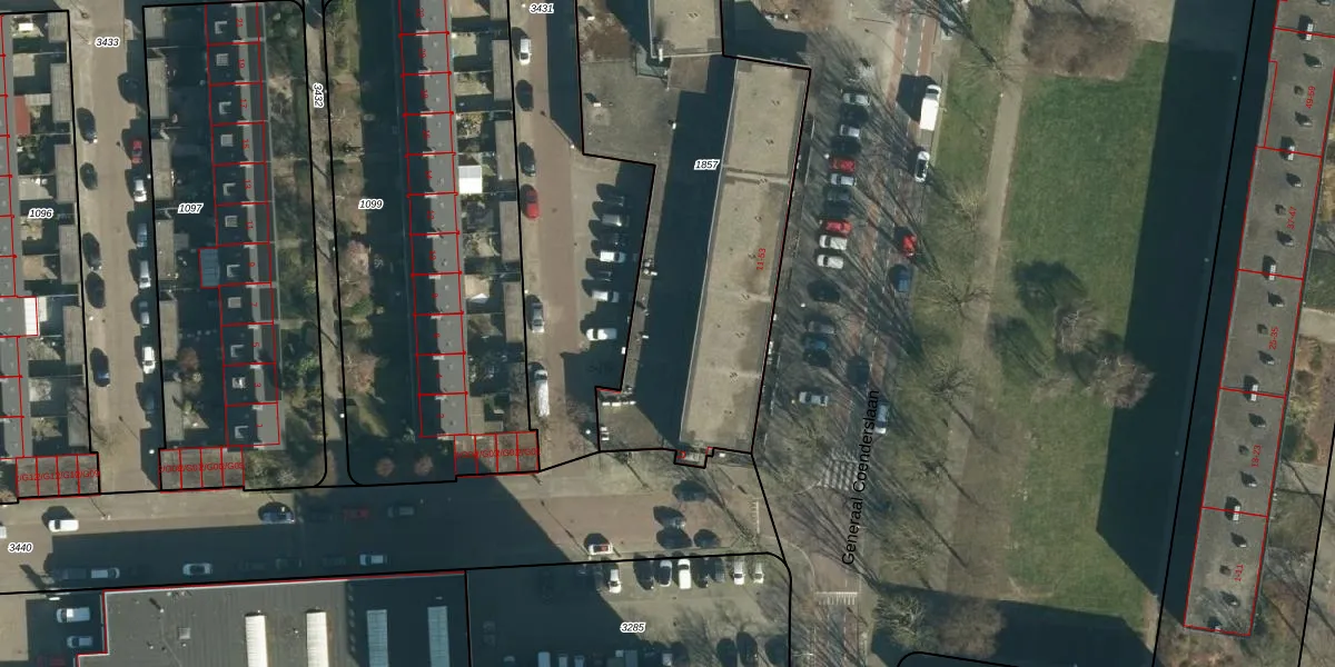Het perceel waarop Generaal Coenderslaan 19 staat heeft een oppervlakte van 1977 m². Dit is een zeer groot perceel. De perceeloppervlakte wordt geregistreerd door het Kadaster. Gedetailleerde informatie over de maten van dit perceel kunt u vinden in het rapport Kadastrale kaart met maatvoering van Generaal Coenderslaan 19.