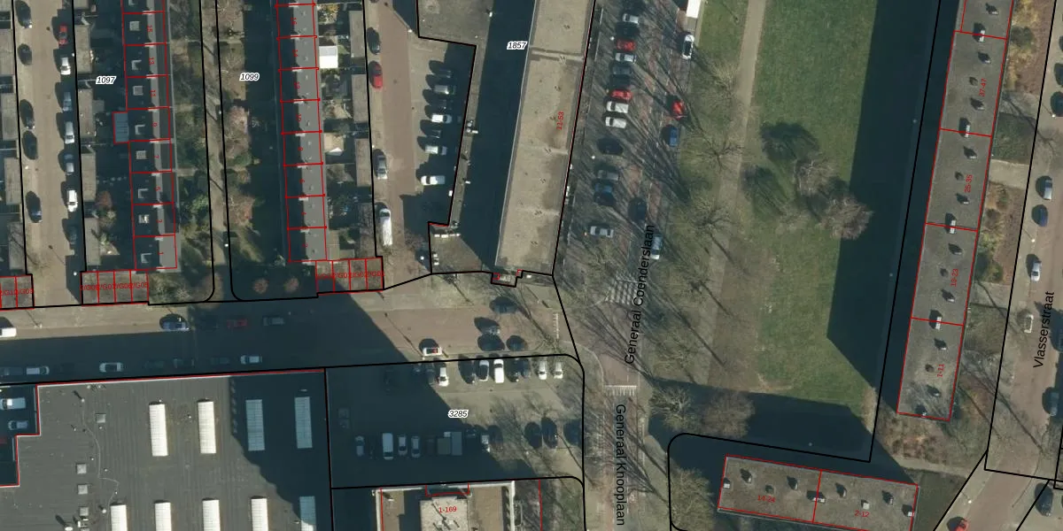 Het perceel waarop Generaal Coenderslaan 39 staat heeft een oppervlakte van 1977 m². Dit is een zeer groot perceel. De perceeloppervlakte wordt geregistreerd door het Kadaster. Gedetailleerde informatie over de maten van dit perceel kunt u vinden in het rapport Kadastrale kaart met maatvoering van Generaal Coenderslaan 39.
