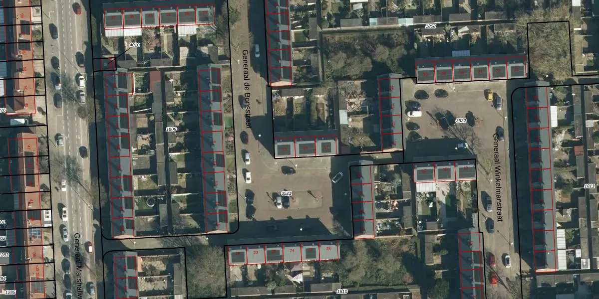 Het perceel waarop Generaal de Bonsstraat 15 staat heeft een oppervlakte van 5928 m². Dit is een zeer groot perceel. De perceeloppervlakte wordt geregistreerd door het Kadaster. Gedetailleerde informatie over de maten van dit perceel kunt u vinden in het rapport Kadastrale kaart met maatvoering van Generaal de Bonsstraat 15.