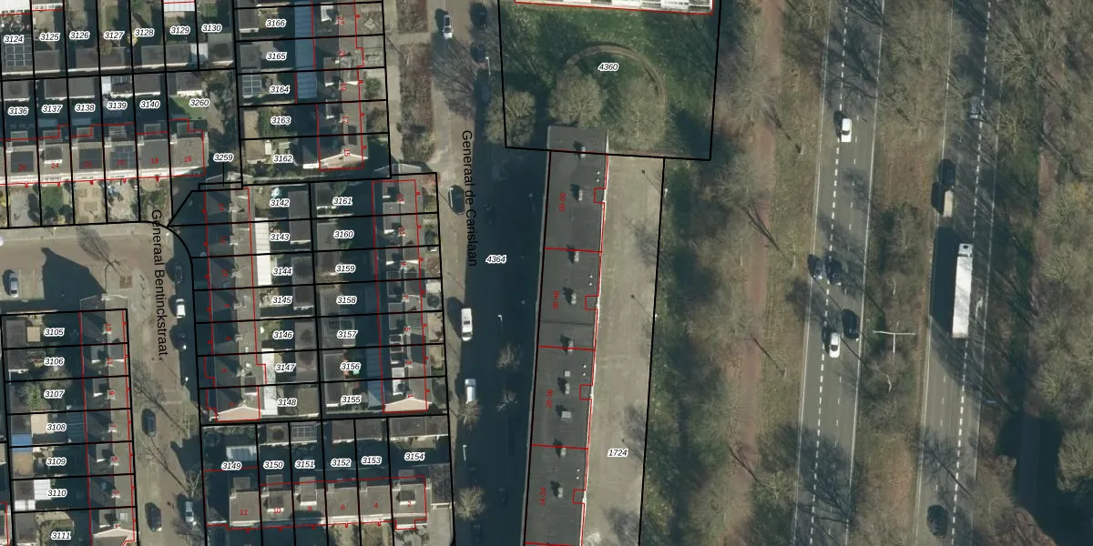 Het perceel waarop Generaal de Carislaan 40 staat heeft een oppervlakte van 1998 m². Dit is een zeer groot perceel. De perceeloppervlakte wordt geregistreerd door het Kadaster. Gedetailleerde informatie over de maten van dit perceel kunt u vinden in het rapport Kadastrale kaart met maatvoering van Generaal de Carislaan 40.