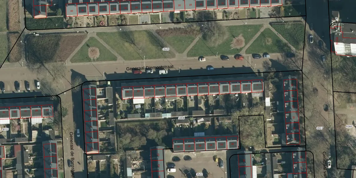 Het perceel waarop Generaal Diemontstraat 15 staat heeft een oppervlakte van 5928 m². Dit is een zeer groot perceel. De perceeloppervlakte wordt geregistreerd door het Kadaster. Gedetailleerde informatie over de maten van dit perceel kunt u vinden in het rapport Kadastrale kaart met maatvoering van Generaal Diemontstraat 15.