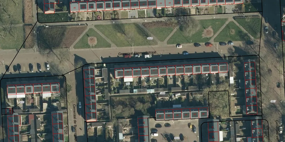 Het perceel waarop Generaal Diemontstraat 19 staat heeft een oppervlakte van 5928 m². Dit is een zeer groot perceel. De perceeloppervlakte wordt geregistreerd door het Kadaster. Gedetailleerde informatie over de maten van dit perceel kunt u vinden in het rapport Kadastrale kaart met maatvoering van Generaal Diemontstraat 19.