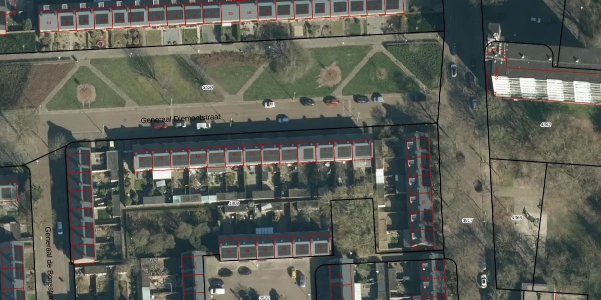 Het perceel waarop Generaal Diemontstraat 7 staat heeft een oppervlakte van 5928 m². Dit is een zeer groot perceel. De perceeloppervlakte wordt geregistreerd door het Kadaster. Gedetailleerde informatie over de maten van dit perceel kunt u vinden in het rapport Kadastrale kaart met maatvoering van Generaal Diemontstraat 7.