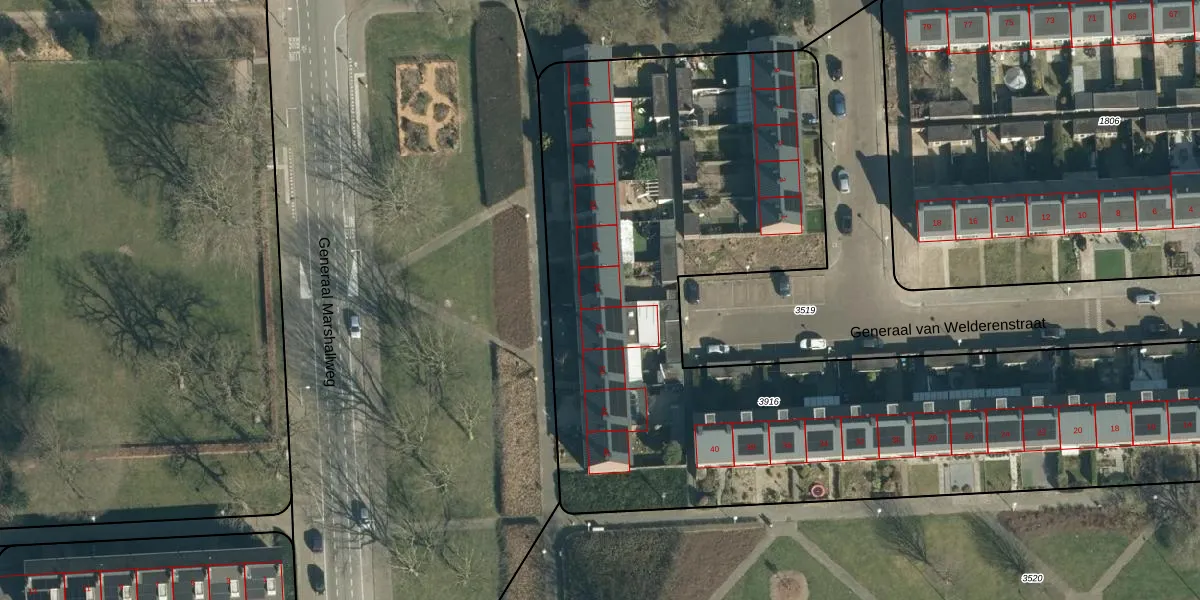 Generaal Marshallweg 54 is gelegen op kadastraal perceel WSL01L3916. Deze kadastrale aanduiding is uniek en wordt gebruikt door het Kadaster om eigendomsrechten en andere zakelijke rechten vast te leggen. Het perceel maakt onderdeel uit van de kadastrale gemeente Woensel.