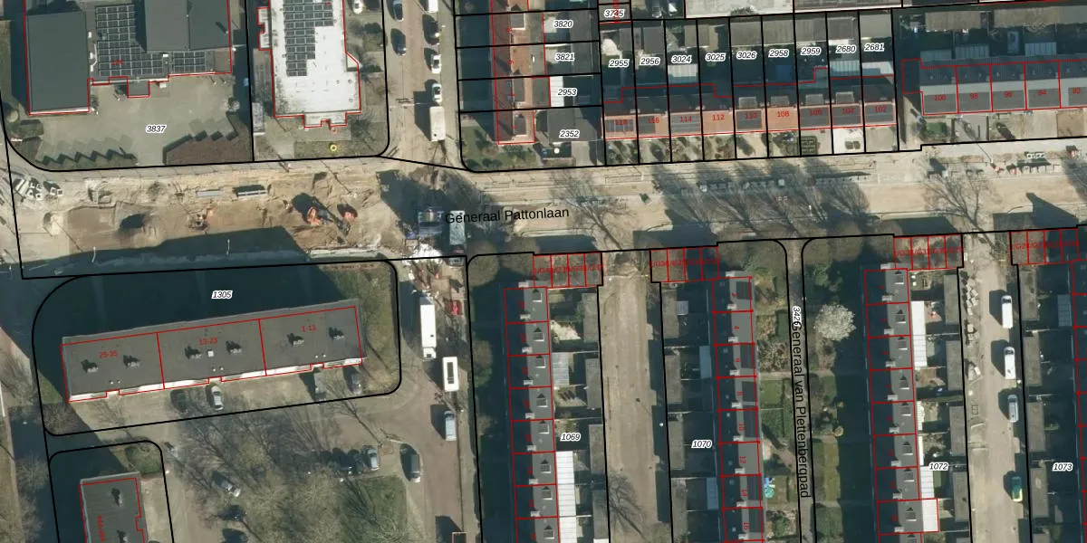 Het perceel waarop Generaal Pattonlaan 1-G40 staat heeft een oppervlakte van 1489 m². Dit is een zeer groot perceel. De perceeloppervlakte wordt geregistreerd door het Kadaster. Gedetailleerde informatie over de maten van dit perceel kunt u vinden in het rapport Kadastrale kaart met maatvoering van Generaal Pattonlaan 1-G40.