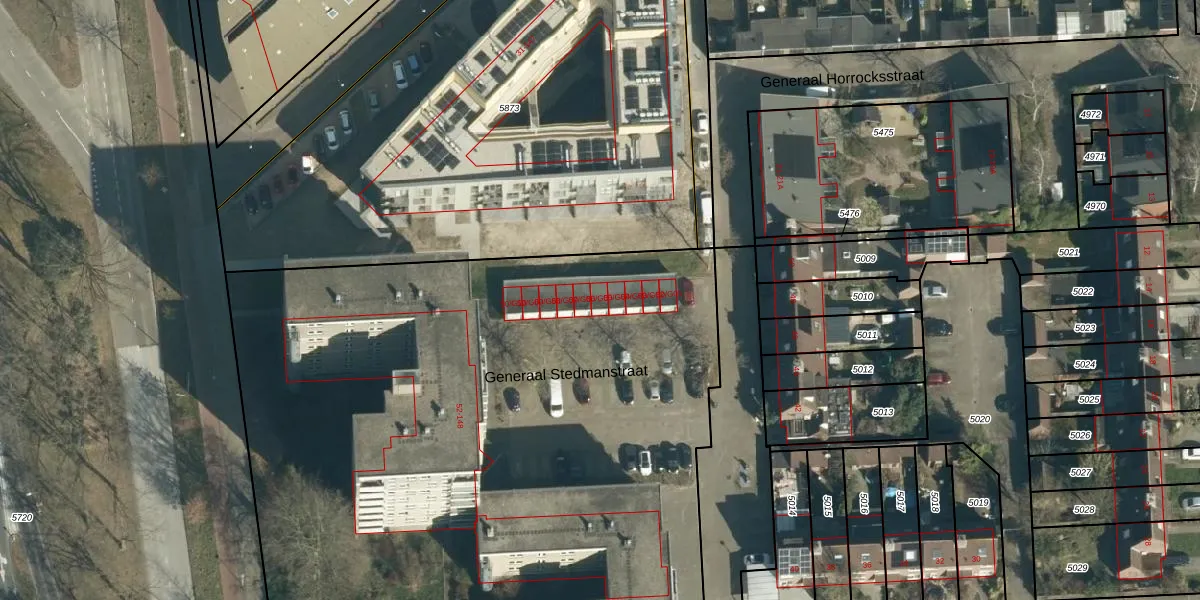Het perceel waarop Generaal Stedmanstraat 50-G05 staat heeft een oppervlakte van 9448 m². Dit is een zeer groot perceel. De perceeloppervlakte wordt geregistreerd door het Kadaster. Gedetailleerde informatie over de maten van dit perceel kunt u vinden in het rapport Kadastrale kaart met maatvoering van Generaal Stedmanstraat 50-G05.