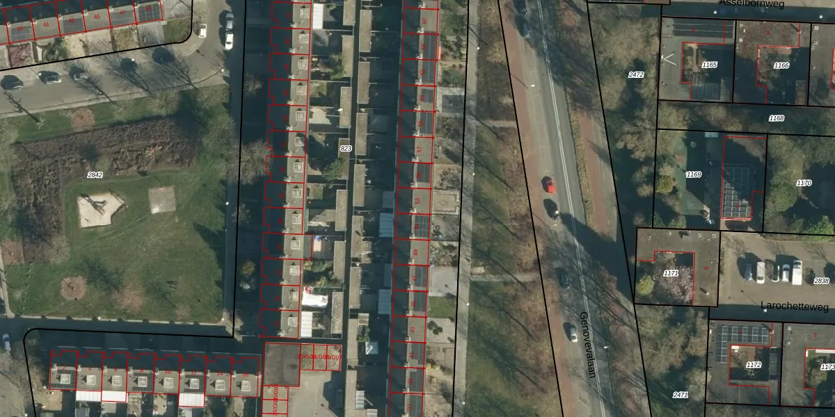 Genovevalaan 53 is gelegen op kadastraal perceel WSL01P823. Deze kadastrale aanduiding is uniek en wordt gebruikt door het Kadaster om eigendomsrechten en andere zakelijke rechten vast te leggen. Het perceel maakt onderdeel uit van de kadastrale gemeente Woensel.