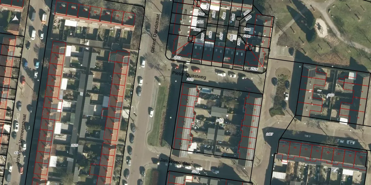 Gerard Davidstraat 1 is gelegen op kadastraal perceel TGR00E1212. Deze kadastrale aanduiding is uniek en wordt gebruikt door het Kadaster om eigendomsrechten en andere zakelijke rechten vast te leggen. Het perceel maakt onderdeel uit van de kadastrale gemeente Tongelre.