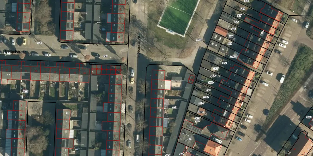 Het perceel waarop Gibeonstraat 20 staat heeft een oppervlakte van 1747 m². Dit is een zeer groot perceel. De perceeloppervlakte wordt geregistreerd door het Kadaster. Gedetailleerde informatie over de maten van dit perceel kunt u vinden in het rapport Kadastrale kaart met maatvoering van Gibeonstraat 20.
