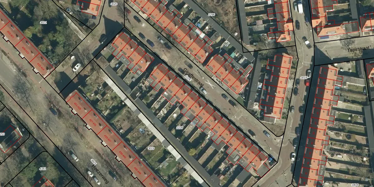 Het perceel waarop Giraffestraat 16 staat heeft een oppervlakte van 3217 m². Dit is een zeer groot perceel. De perceeloppervlakte wordt geregistreerd door het Kadaster. Gedetailleerde informatie over de maten van dit perceel kunt u vinden in het rapport Kadastrale kaart met maatvoering van Giraffestraat 16.