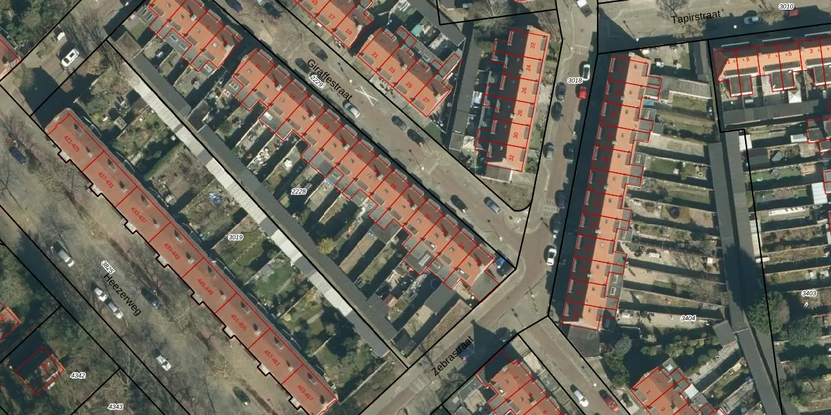 Het perceel waarop Giraffestraat 28 staat heeft een oppervlakte van 3217 m². Dit is een zeer groot perceel. De perceeloppervlakte wordt geregistreerd door het Kadaster. Gedetailleerde informatie over de maten van dit perceel kunt u vinden in het rapport Kadastrale kaart met maatvoering van Giraffestraat 28.