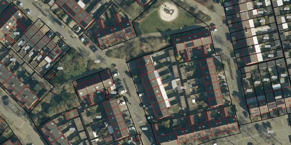 Het perceel waarop Girondelaan 14 staat heeft een oppervlakte van 4372 m². Dit is een zeer groot perceel. De perceeloppervlakte wordt geregistreerd door het Kadaster. Gedetailleerde informatie over de maten van dit perceel kunt u vinden in het rapport Kadastrale kaart met maatvoering van Girondelaan 14.