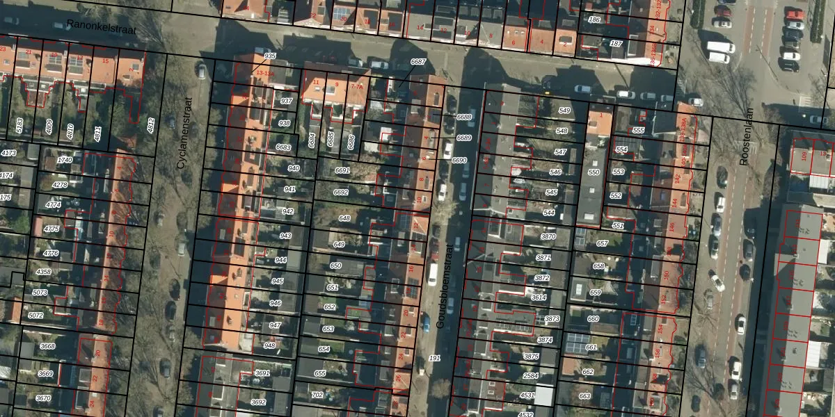 Gebruik de zoekbalk of klik op een perceel voor informatie over de adressen binnen dit perceel.