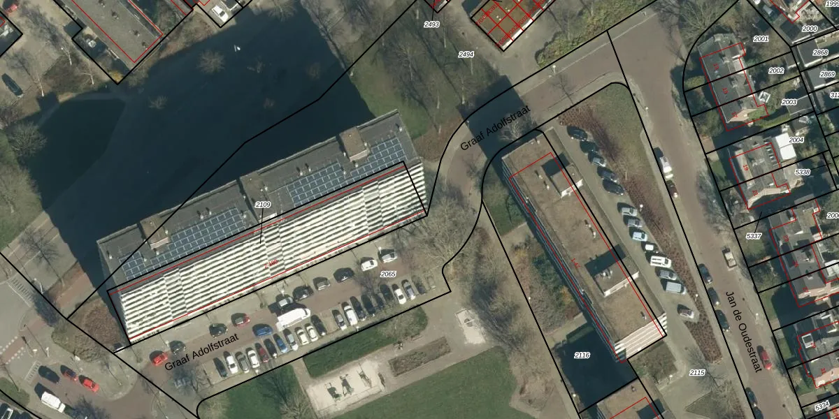 Het perceel waarop Graaf Adolfstraat 2 staat heeft een oppervlakte van 1090 m². Dit is een zeer groot perceel. De perceeloppervlakte wordt geregistreerd door het Kadaster. Gedetailleerde informatie over de maten van dit perceel kunt u vinden in het rapport Kadastrale kaart met maatvoering van Graaf Adolfstraat 2.
