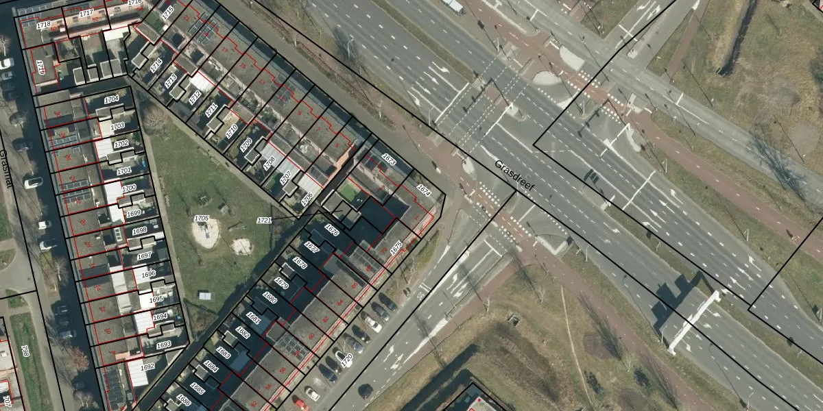 Grasdreef 1 is gelegen op kadastraal perceel STR03G1674. Deze kadastrale aanduiding is uniek en wordt gebruikt door het Kadaster om eigendomsrechten en andere zakelijke rechten vast te leggen. Het perceel maakt onderdeel uit van de kadastrale gemeente Strijp.
