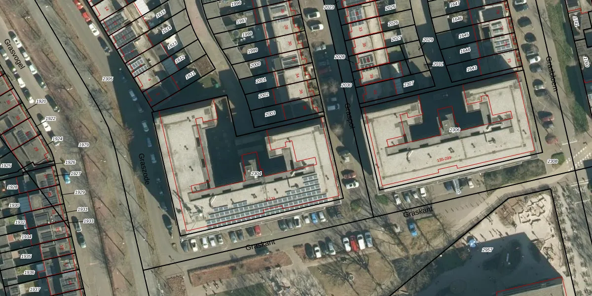 Het perceel waarop Graskant 105 staat heeft een oppervlakte van 1987 m². Dit is een zeer groot perceel. De perceeloppervlakte wordt geregistreerd door het Kadaster. Gedetailleerde informatie over de maten van dit perceel kunt u vinden in het rapport Kadastrale kaart met maatvoering van Graskant 105.