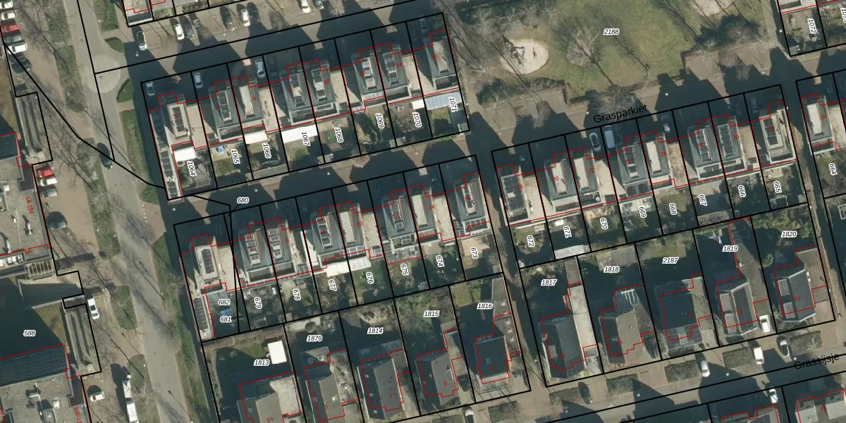 Grasparkiet 14 is gelegen op kadastraal perceel STR03G674. Deze kadastrale aanduiding is uniek en wordt gebruikt door het Kadaster om eigendomsrechten en andere zakelijke rechten vast te leggen. Het perceel maakt onderdeel uit van de kadastrale gemeente Strijp.