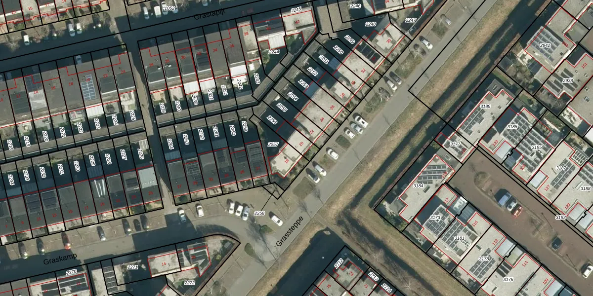 Grassteppe 20 is gelegen op kadastraal perceel STR03G2256. Deze kadastrale aanduiding is uniek en wordt gebruikt door het Kadaster om eigendomsrechten en andere zakelijke rechten vast te leggen. Het perceel maakt onderdeel uit van de kadastrale gemeente Strijp.