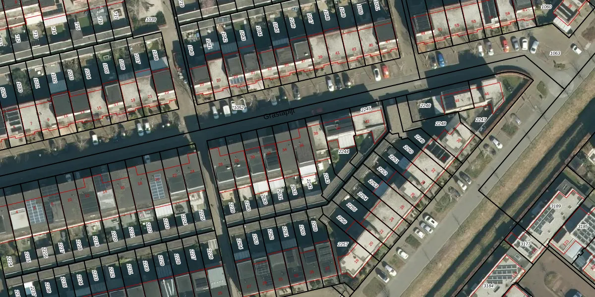 Grastapijt 36 is gelegen op kadastraal perceel STR03G2242. Deze kadastrale aanduiding is uniek en wordt gebruikt door het Kadaster om eigendomsrechten en andere zakelijke rechten vast te leggen. Het perceel maakt onderdeel uit van de kadastrale gemeente Strijp.