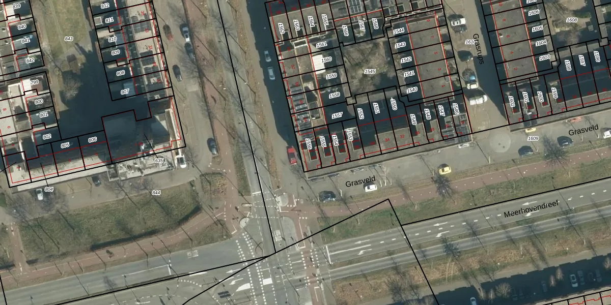 Grasveld 44 is gelegen op kadastraal perceel STR03G1556. Deze kadastrale aanduiding is uniek en wordt gebruikt door het Kadaster om eigendomsrechten en andere zakelijke rechten vast te leggen. Het perceel maakt onderdeel uit van de kadastrale gemeente Strijp.