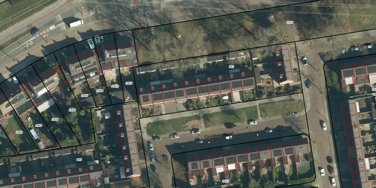 Het perceel waarop Grimbeertlaan 57 staat heeft een oppervlakte van 2393 m². Dit is een zeer groot perceel. De perceeloppervlakte wordt geregistreerd door het Kadaster. Gedetailleerde informatie over de maten van dit perceel kunt u vinden in het rapport Kadastrale kaart met maatvoering van Grimbeertlaan 57.