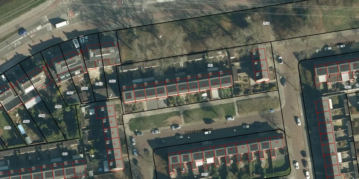 Het perceel waarop Grimbeertlaan 59 staat heeft een oppervlakte van 2393 m². Dit is een zeer groot perceel. De perceeloppervlakte wordt geregistreerd door het Kadaster. Gedetailleerde informatie over de maten van dit perceel kunt u vinden in het rapport Kadastrale kaart met maatvoering van Grimbeertlaan 59.