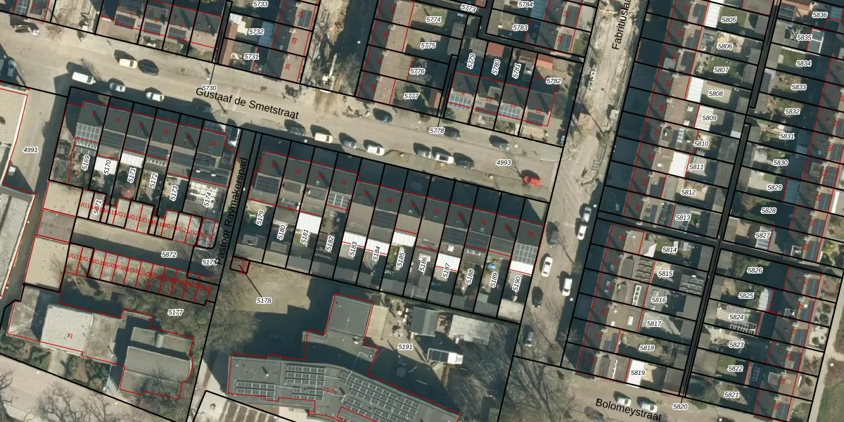 Gustaaf de Smetstraat 28 is gelegen op kadastraal perceel STM00E5185. Deze kadastrale aanduiding is uniek en wordt gebruikt door het Kadaster om eigendomsrechten en andere zakelijke rechten vast te leggen. Het perceel maakt onderdeel uit van de kadastrale gemeente Stratum.