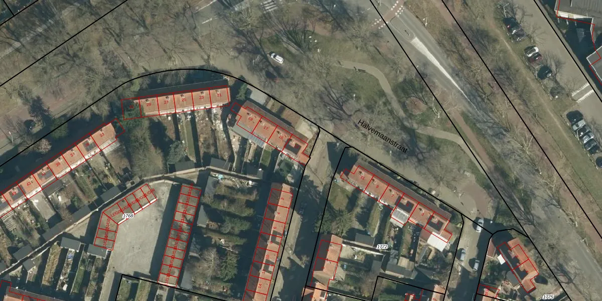 Halvemaanstraat 13 is gelegen op kadastraal perceel STR03C1768. Deze kadastrale aanduiding is uniek en wordt gebruikt door het Kadaster om eigendomsrechten en andere zakelijke rechten vast te leggen. Het perceel maakt onderdeel uit van de kadastrale gemeente Strijp.