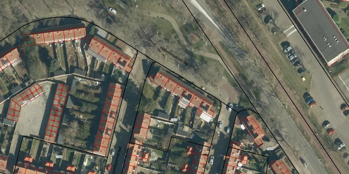 Het perceel waarop Halvemaanstraat 9 staat heeft een oppervlakte van 1735 m². Dit is een zeer groot perceel. De perceeloppervlakte wordt geregistreerd door het Kadaster. Gedetailleerde informatie over de maten van dit perceel kunt u vinden in het rapport Kadastrale kaart met maatvoering van Halvemaanstraat 9.