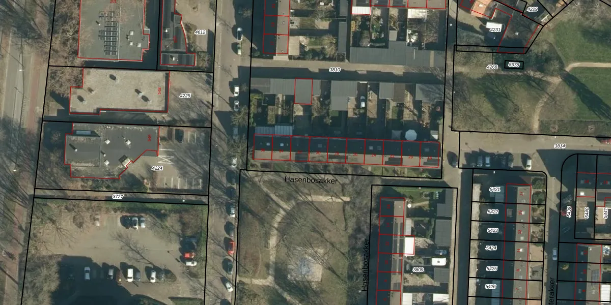Het perceel waarop Hasenbosakker 32 staat heeft een oppervlakte van 4253 m². Dit is een zeer groot perceel. De perceeloppervlakte wordt geregistreerd door het Kadaster. Gedetailleerde informatie over de maten van dit perceel kunt u vinden in het rapport Kadastrale kaart met maatvoering van Hasenbosakker 32.